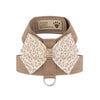 The Tinkie Dog Harness has an elegant design that offers a glamorous look while being comfortable for your dog and easy for you to maintain. Made from Ultrasuede® fabric with the soft texture and feel of premium suede. Ultrasuede® also has the highest grade of durability, making this harness resistant to stains and discoloration, it is even machine washable! Any pulling is across the shoulders and not the neck, resulting in pure comfort for your dog. Hook-and-loop closures make for a no-fuss, secure fit. Handcrafted to order in Sunny San Diego, California, USA.