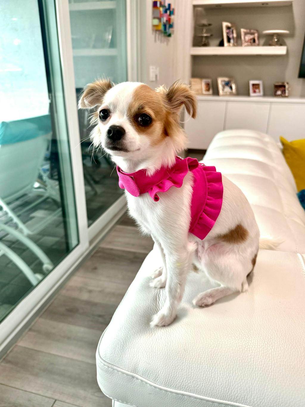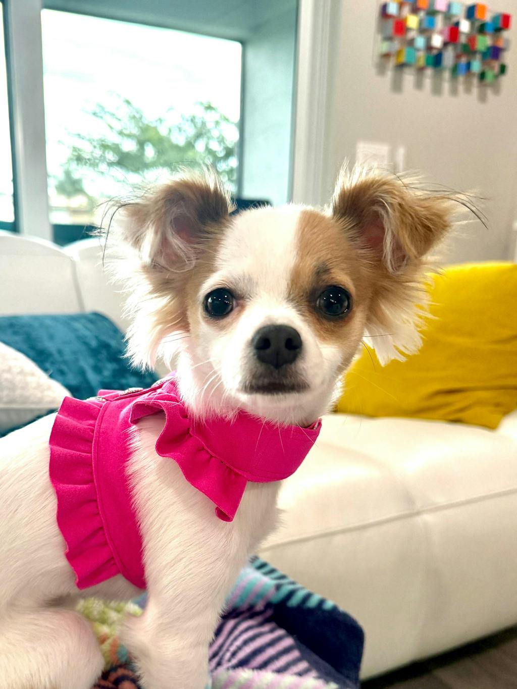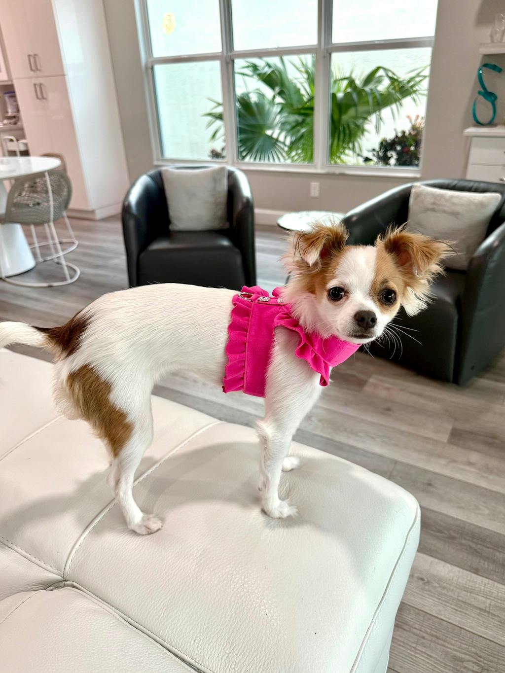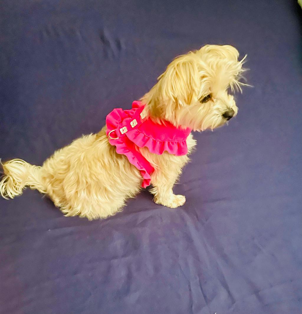 The Tinkie Dog Harness has an elegant design that offers a glamorous look while being comfortable for your dog and easy for you to maintain. Made from Ultrasuede® fabric with the soft texture and feel of premium suede. Ultrasuede® also has the highest grade of durability, making this harness resistant to stains and discoloration, it is even machine washable! Any pulling is across the shoulders and not the neck, resulting in pure comfort for your dog. Hook-and-loop closures make for a no-fuss, secure fit. Handcrafted to order in Sunny San Diego, California, USA.