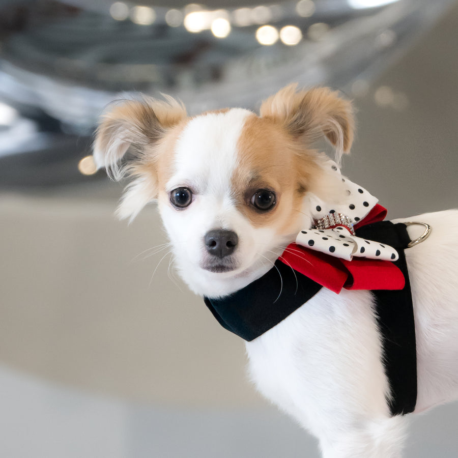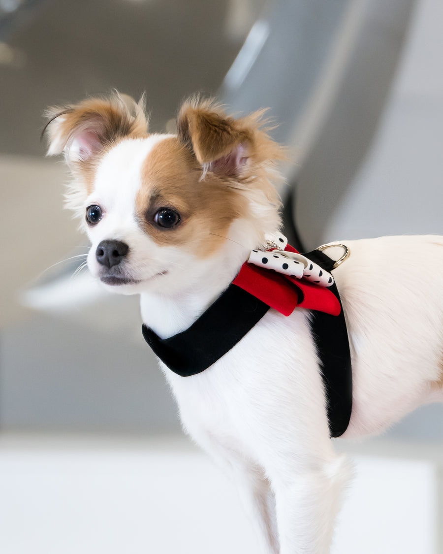 The Tinkie Dog Harness has an elegant design that offers a glamorous look while being comfortable for your dog and easy for you to maintain. Made from Ultrasuede® fabric with the soft texture and feel of premium suede. Ultrasuede® also has the highest grade of durability, making this harness resistant to stains and discoloration, it is even machine washable! Any pulling is across the shoulders and not the neck, resulting in pure comfort for your dog. Hook-and-loop closures make for a no-fuss, secure fit. Handcrafted to order in Sunny San Diego, California, USA.